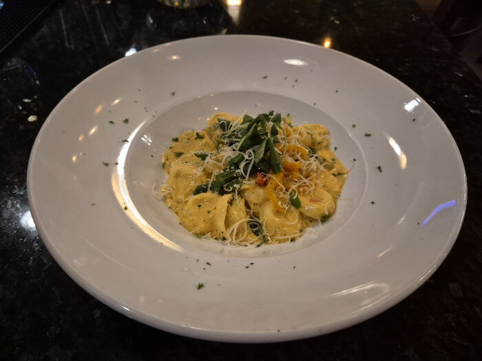 Pasta Filled With Beef, Feta Cream Cheese Sauce, Parmesan Cheese<,Onions And Peppers.
